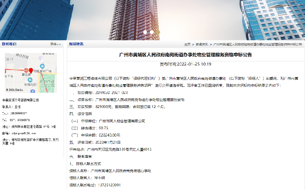 鼎點(diǎn)娛樂(lè)工程咨詢有限公司(以下簡(jiǎn)稱“招標(biāo)代理機(jī)構(gòu)”)受廣州市黃埔區(qū)人民政府南崗街道辦事處 (以下簡(jiǎn)稱“招標(biāo)人”)的委托,對(duì)廣州市黃埔區(qū)人民政府南崗街道辦事處物業(yè)管理服務(wù)資格項(xiàng)目”進(jìn)行公開遴選采購(gòu)。現(xiàn)評(píng)審工作已圓滿結(jié)束,現(xiàn)就本次招標(biāo)的中標(biāo)結(jié)果公告如下:一、項(xiàng)目編號(hào):ZDYRGD-2021-023二、項(xiàng)目名[詳細(xì)]